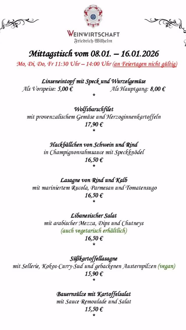 Die Weinwirtschaft Friedrich-Wilhelm ist ein Restaurant für Trier und seine Besucher. Serviert wird eine bodenständige Küche mit viel Liebe zum Produkt und zur Tradition, ergänzt um mediterrane und orientalische Einflüsse. Es wird für jeden etwas dabei sein.